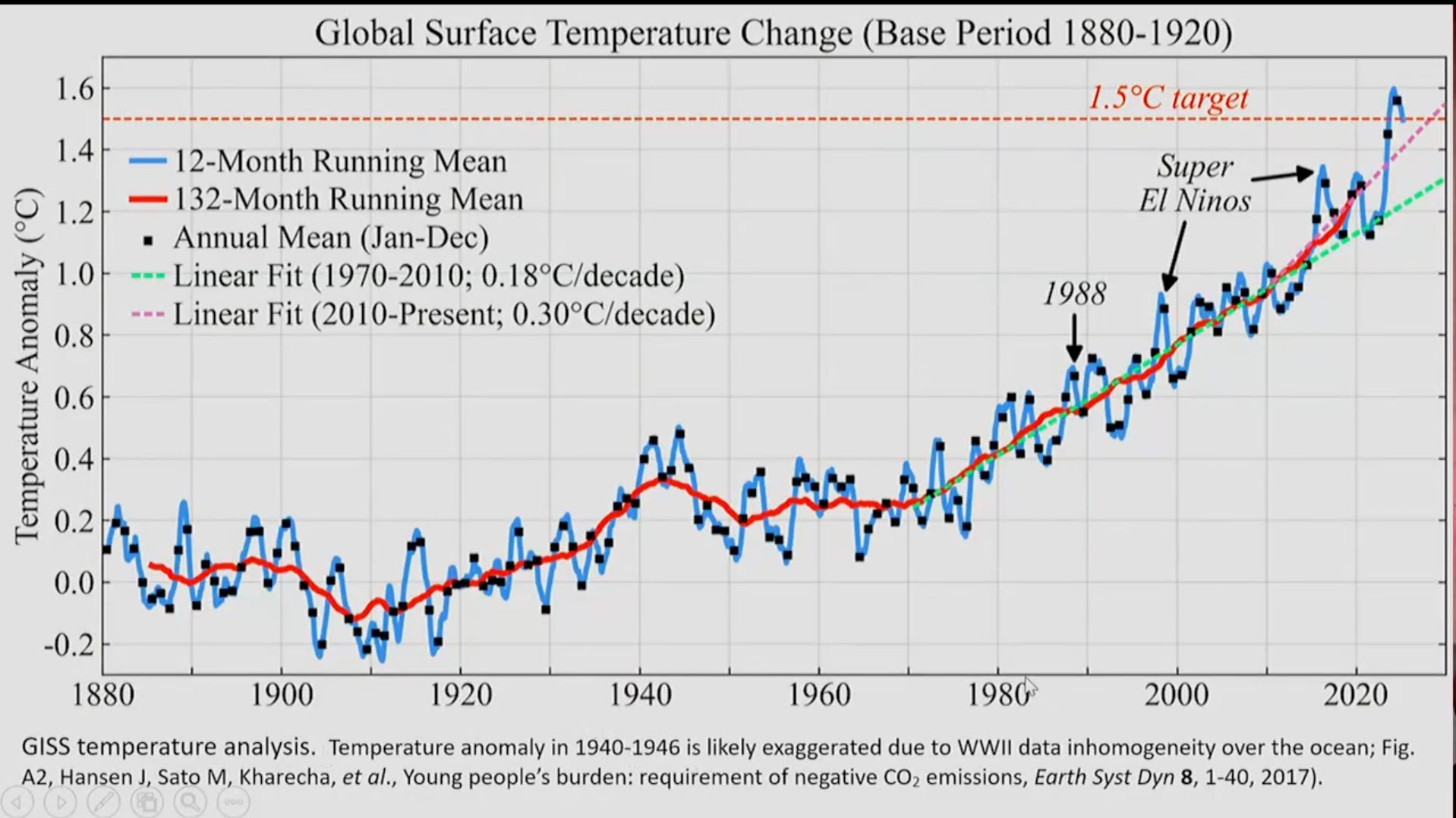 It is not James Hansen’s job to boil down his points into tractable sound bites. But unless there are trusted leaders of all ages, active in political or cultural or sports-league or entertainment circles, who understand these risks and are willing to talk about them, communicating these things to younger people won’t happen. Jim Hansen’s overriding goal, it seems, is to make sure this somehow takes place. Here’s the clear gist of his presentation: “Young people need to be honestly informed about the situation and how old people screwed up.“